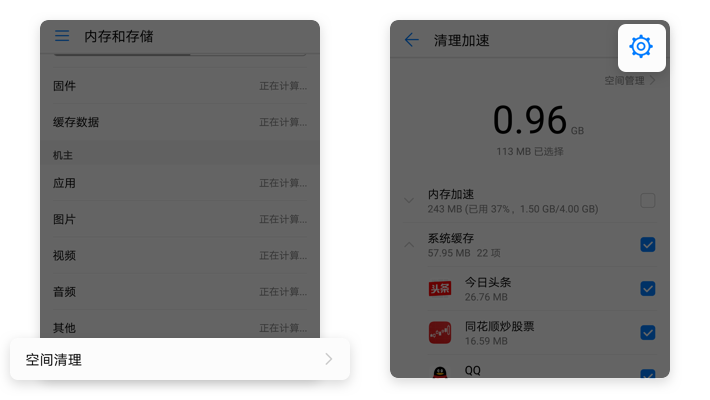【内存和存储】→【空间清理】→【设置】