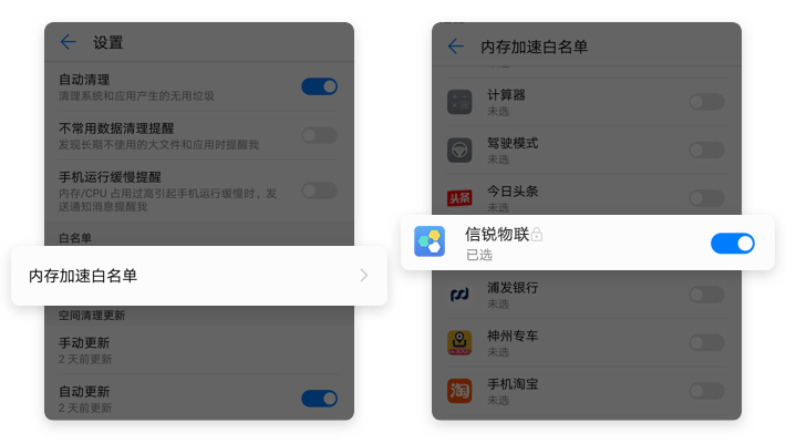 【设置】→【内存加速白名单】→开启【信锐物联】