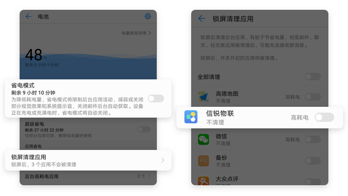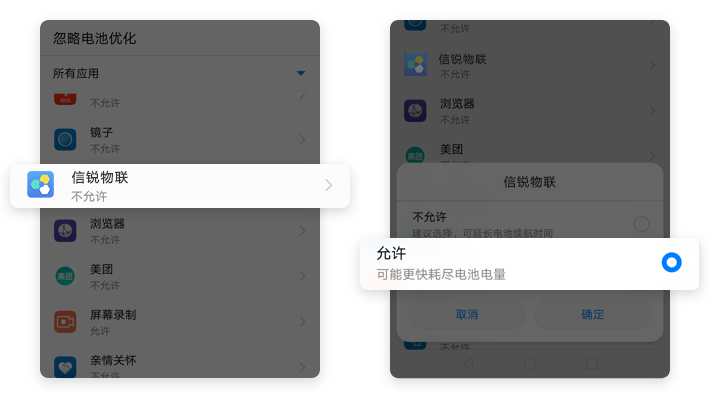 【电池】→【省电模式】关闭→【锁屏清理应用】→【信锐物联】关闭
