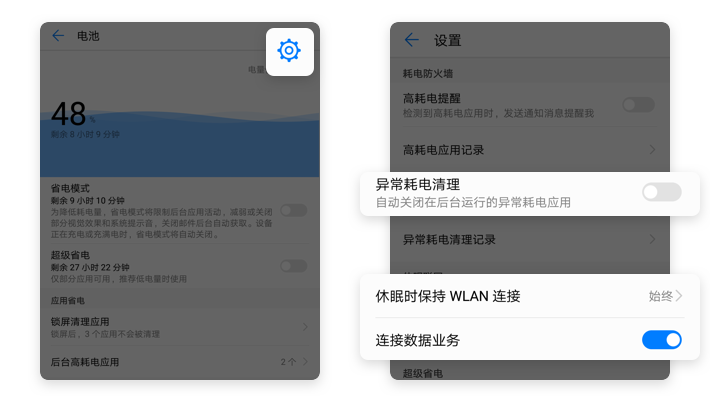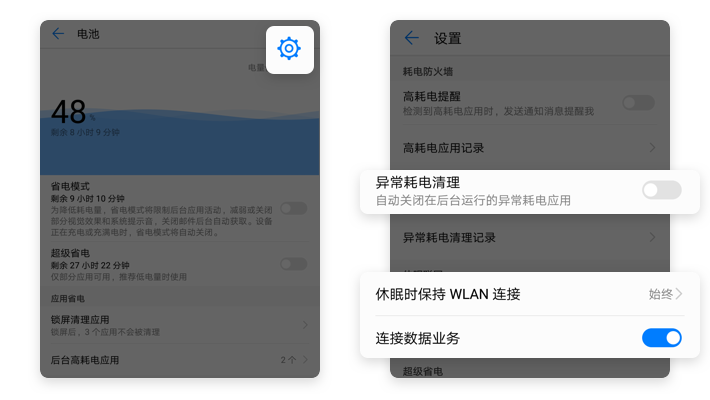 【电池】→【设置】→关闭【异常耗电清理】→【休眠状态下保持WLAN连接】选择始终 →开启【连接数据业务】