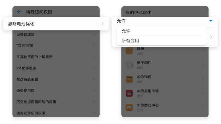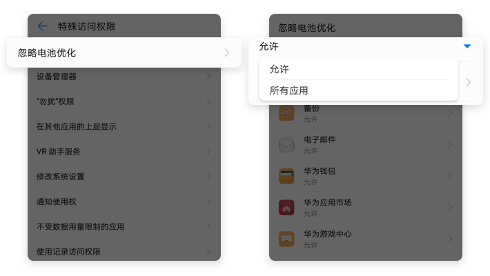 【特殊访问权限】→【忽略电池优化】→点击【▼】→【所有应用】
