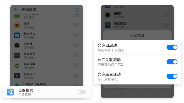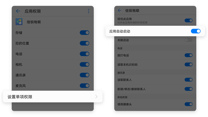 【信锐物联】→【设置单项权限】→开启【应用自动启动】