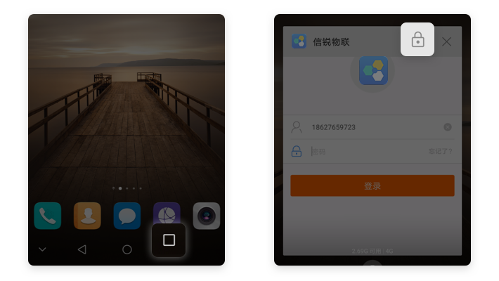 桌面【□】按钮/滑动主页键→系统弹出最近使用软件【信锐物联】→右上角【锁定】