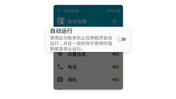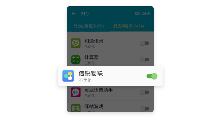 【内存】→ 【自动运行应用程序】→【信锐物联】→ 开启【不优化】