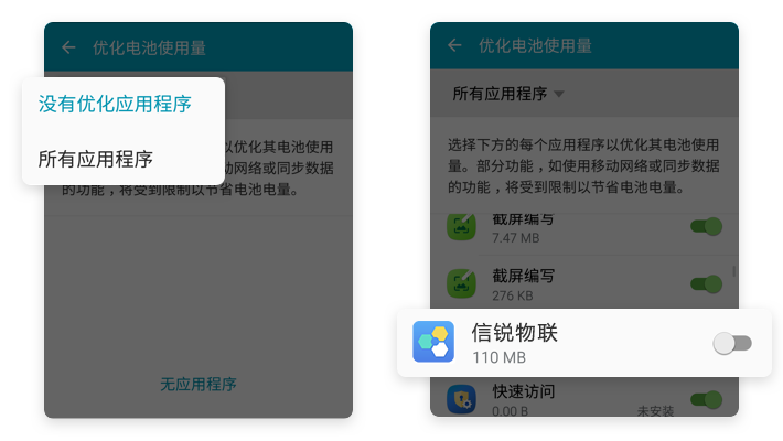 【右上角圆点】→【优化电池使用量】→【没有优化应用程序/所有应用程序】→【关闭信锐物联】