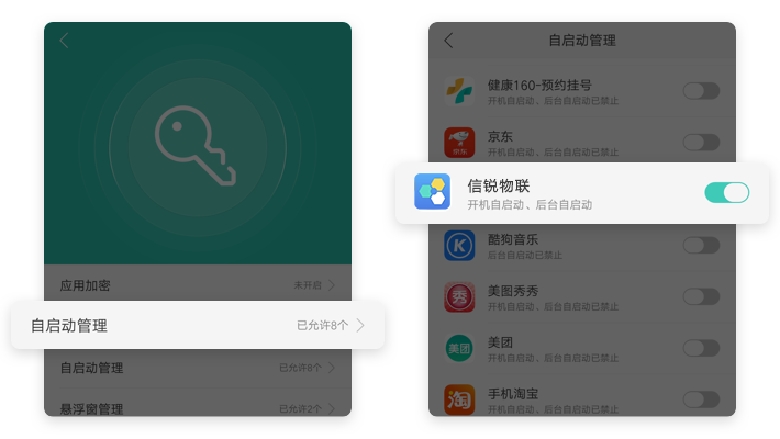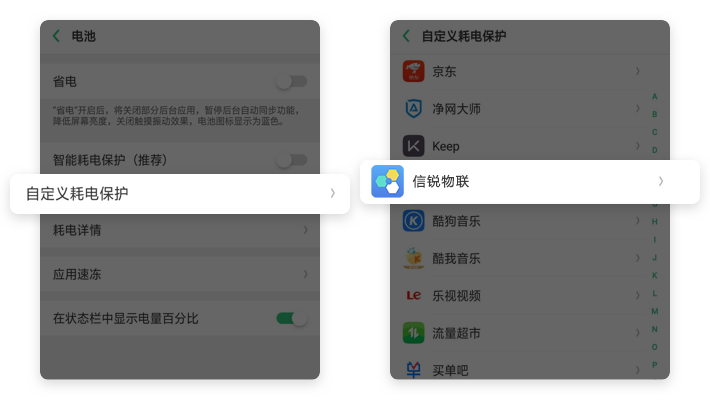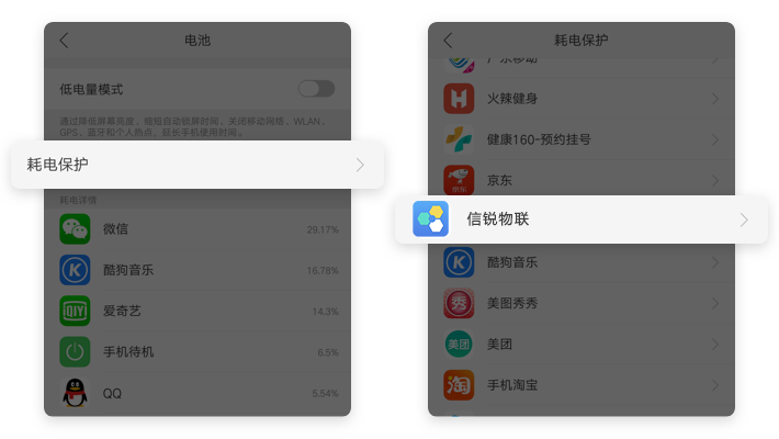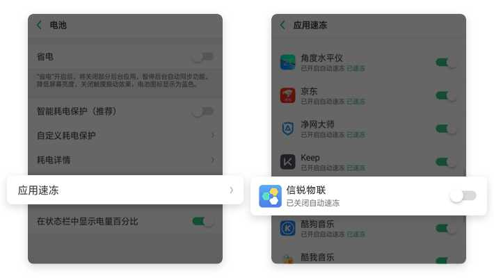 【电池】→【应用速冻】→ 信锐物联【关闭】