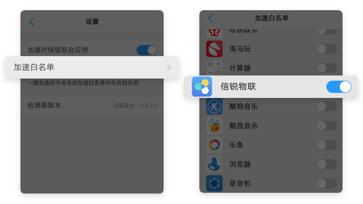 【设置按钮】→ 【加速白名单】→【开启信锐物联】