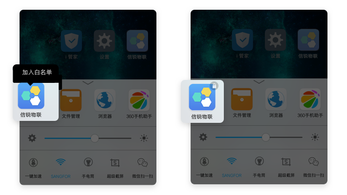 B、点击手机左菜单键 → 下滑【信锐物联】→ 信锐物联右上角出现锁头即加入白名单