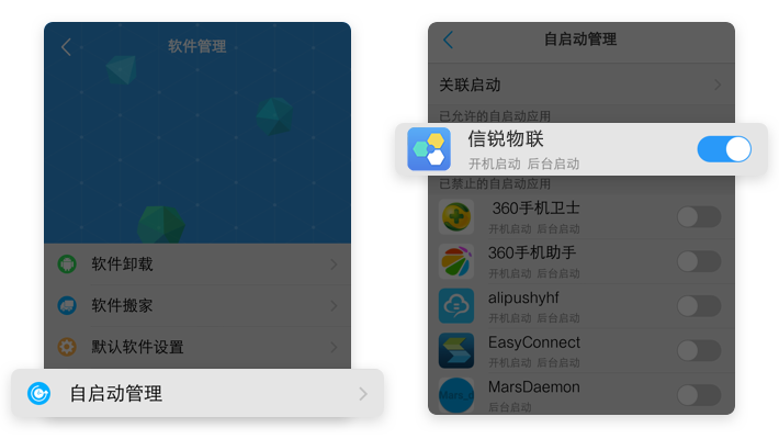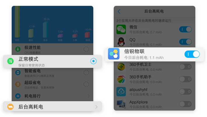 【省电管理】→【正常模式】→【后台高耗电】→【开启信锐物联】