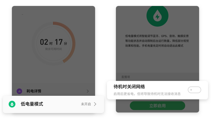 【电量管理】→【低电量模式】→【待机时关闭网络】→【关闭按钮】