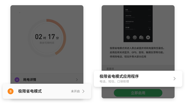 【电量管理】→【极限省电模式】→【极限省电模式应用程序】