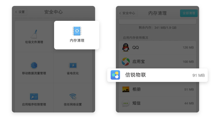 【安全中心】→【内存清理】→【信锐物联】