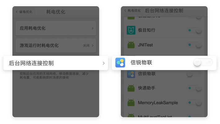 【耗电优化】→【后台网络连接控制】→【信锐物联】开启按钮