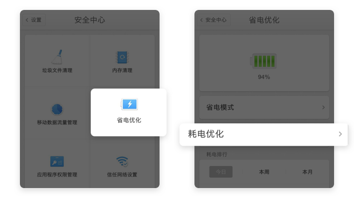 【安全中心】→【省电优化】→【耗电优化】