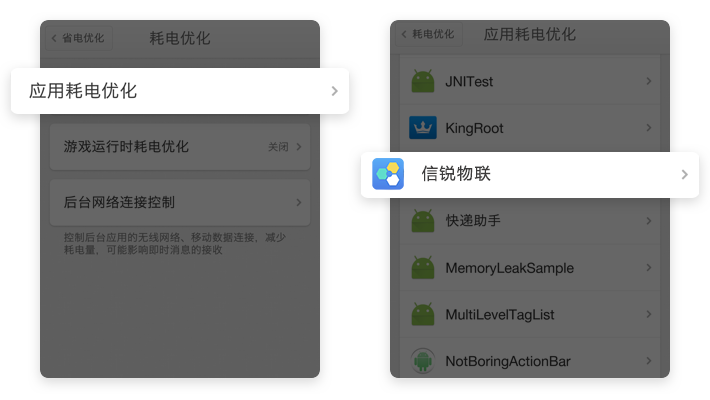 【耗电优化】→【应用耗电优化】→【信锐物联】