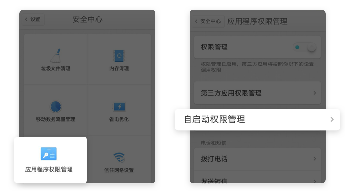 【安全中心】→【应用程序权限管理】→【自启动权限管理】