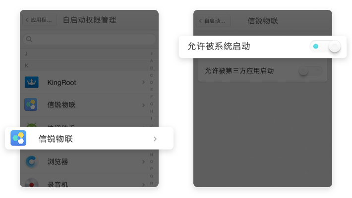 【自启动权限管理】→【信锐物联】→【允许被系统启动】
